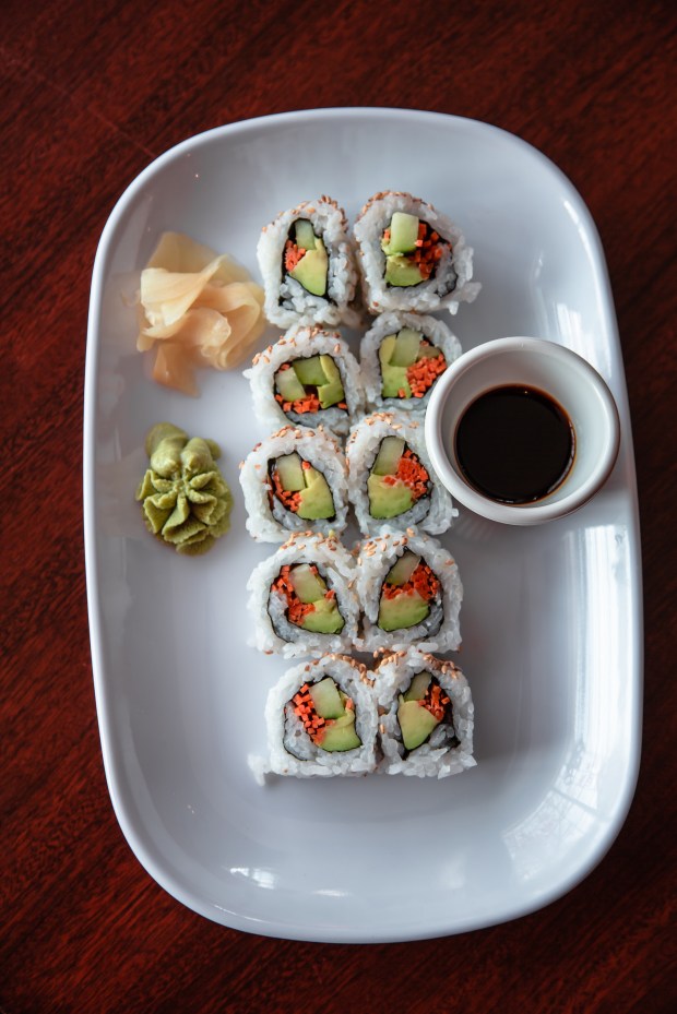 Crabmeat salad spicy roll: Avocado and cucumber topped with sesame seeds and spicy mayonnaise sauce