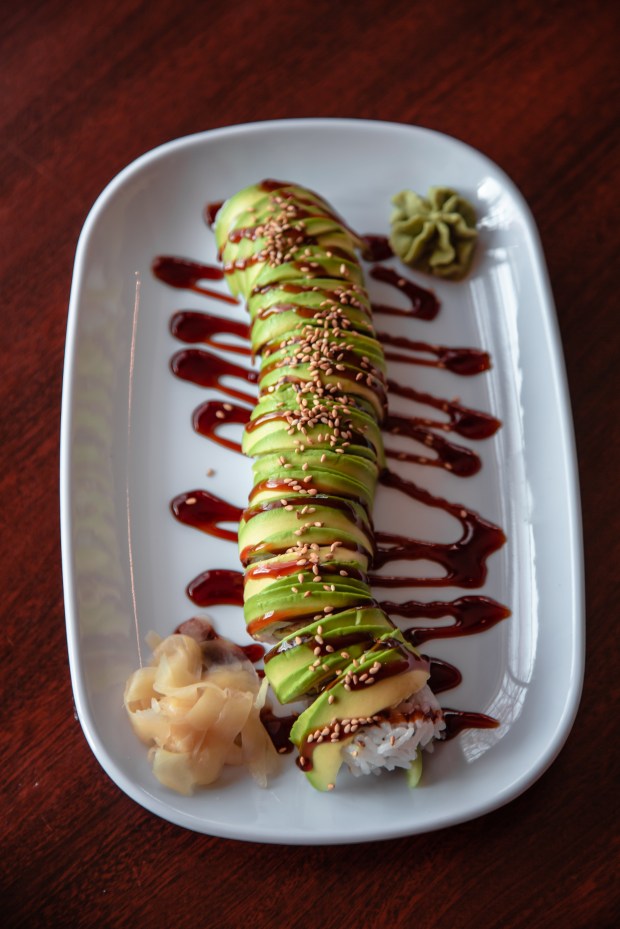 Grilled unagi and cucumber topped with avocado, sesame seeds, and eel sauce
