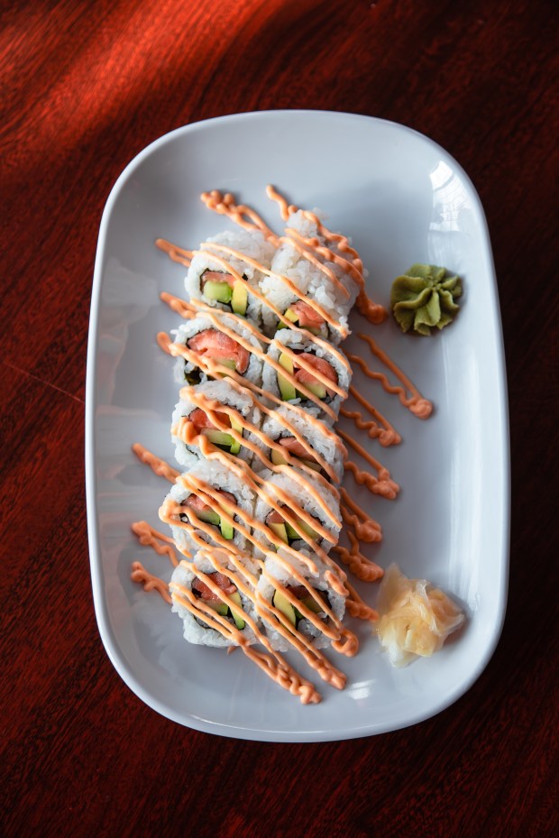 Salmon spicy roll: Avocado and cucumber topped with sesame seeds and spicy mayonnaise sauce