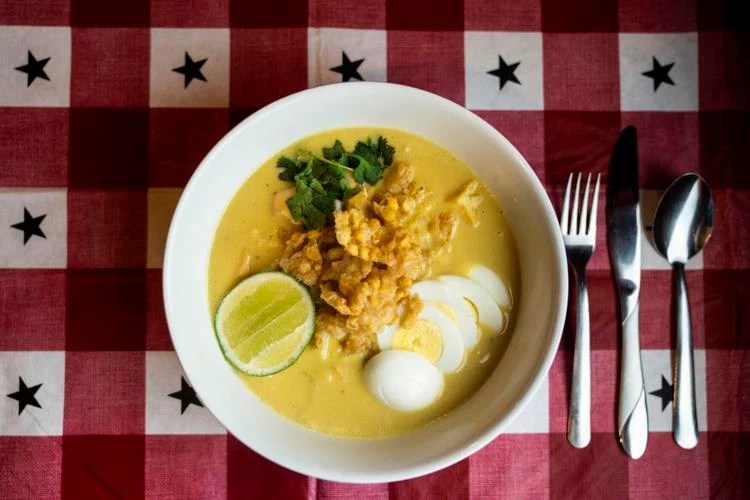 Served with wheat noodles, chicken, coconut milk, chickpea paste, onion, and crispy chickpea on top